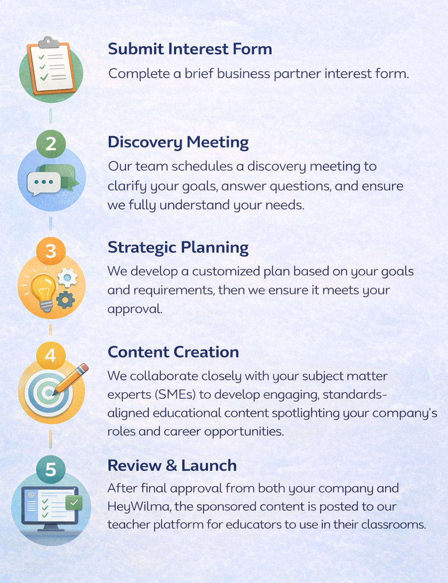 Grounded in over 20 years of classroom and education experience, our educator-led team works with companies to create standards-aligned lessons that spotlight real roles, skills, and career pathways—building authentic brand awareness in classrooms while being delivered to teachers for free and used in real learning environments.