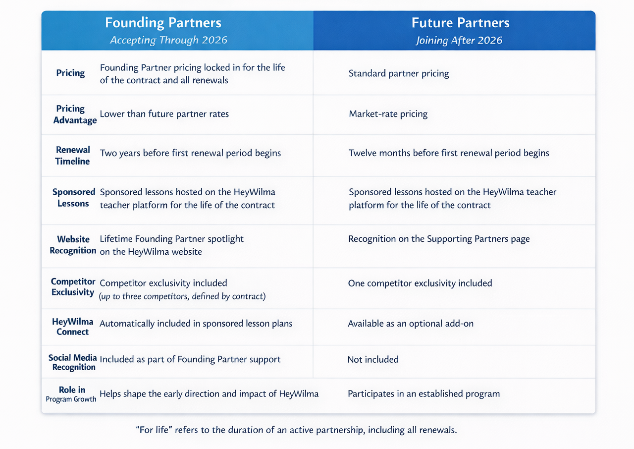 Founding Partners help shape the early reach and direction of our work while receiving benefits that will not be available after 2026, including preferred pricing, extended launch timelines, and enhanced visibility. Organizations that join later still gain meaningful classroom impact, but Founding Partners receive added recognition and flexibility in exchange for their early commitment.